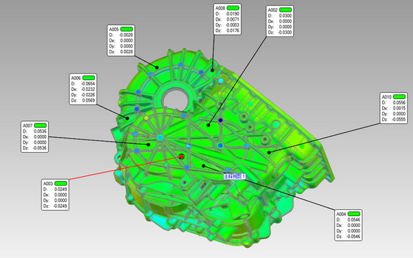 快速準(zhǔn)確地獲取了汽車變速箱殼體的3D偏差數(shù)據(jù),準(zhǔn)確高效地找到變速箱殼體的誤差,根本上保證了變速箱殼體的生產(chǎn)質(zhì)量安全。同時(shí)大大簡化汽車制造業(yè)零部件的生產(chǎn)質(zhì)量把控難度,提高檢測的效率,獲得客戶的認(rèn)可和好評(píng);另一方面,獲取高精度的三維數(shù)據(jù)讓只有合格的變速箱殼體才能裝配進(jìn)入汽車,大大保證汽車駕駛工作環(huán)境的安全性,為駕駛者保駕護(hù)航!